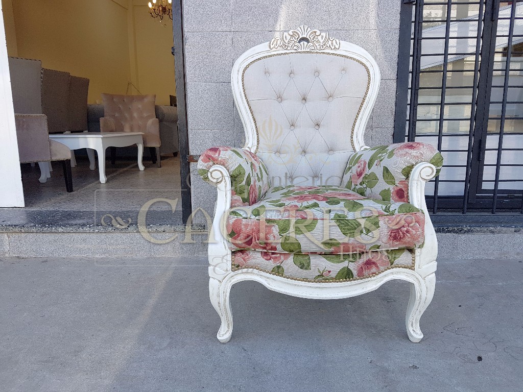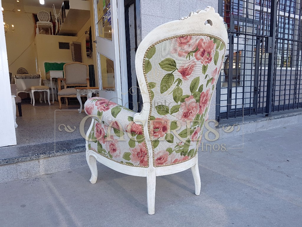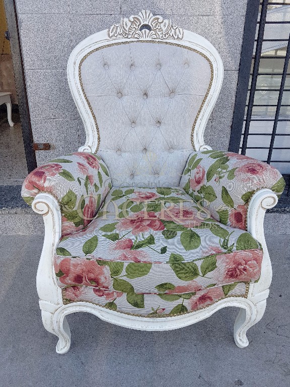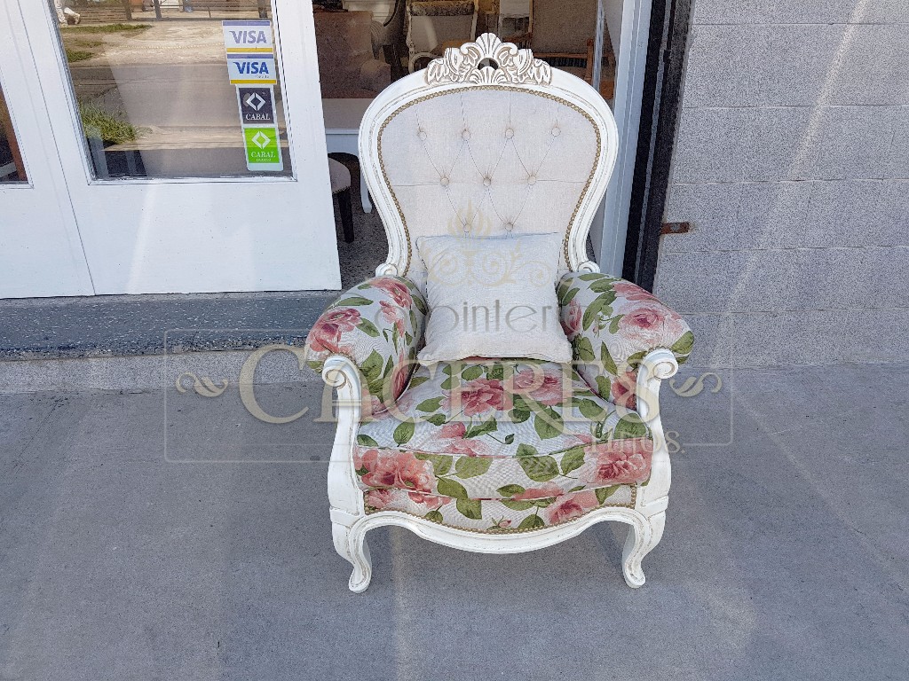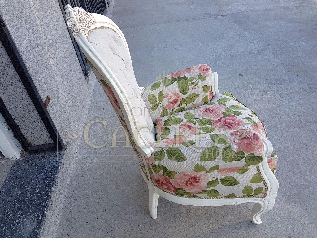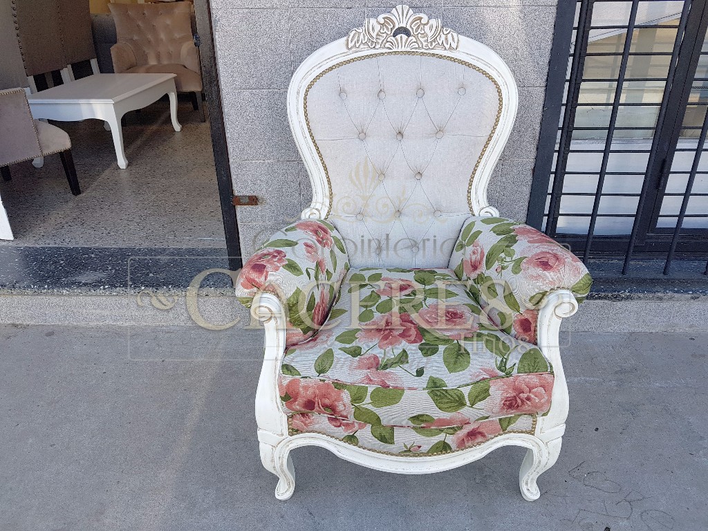 Realizadas en maderas guindo, tallado a mano y laqueado poiuretano, tapizadas en tela lino estampado.