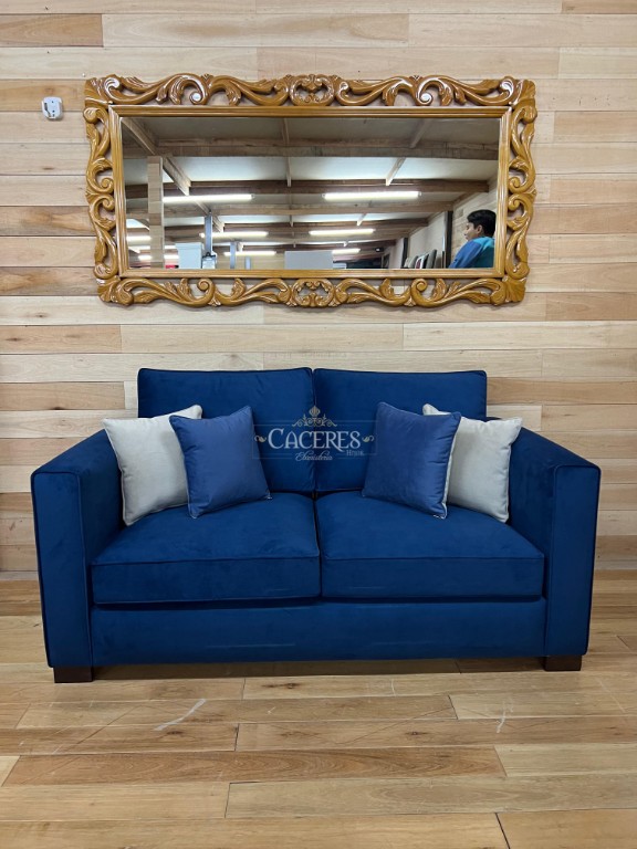 Realizado en madera maciza tallado artesanalmente, terminaciones a gusto (Tachas o cordón de vivo), tapizado en pana azul, patas a gusto.