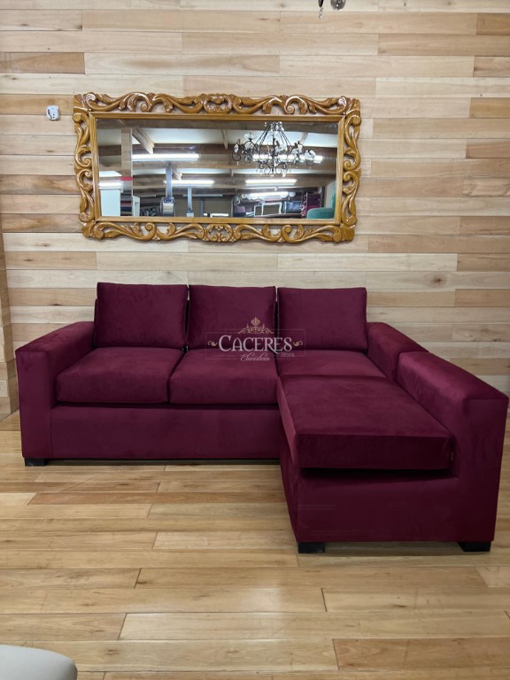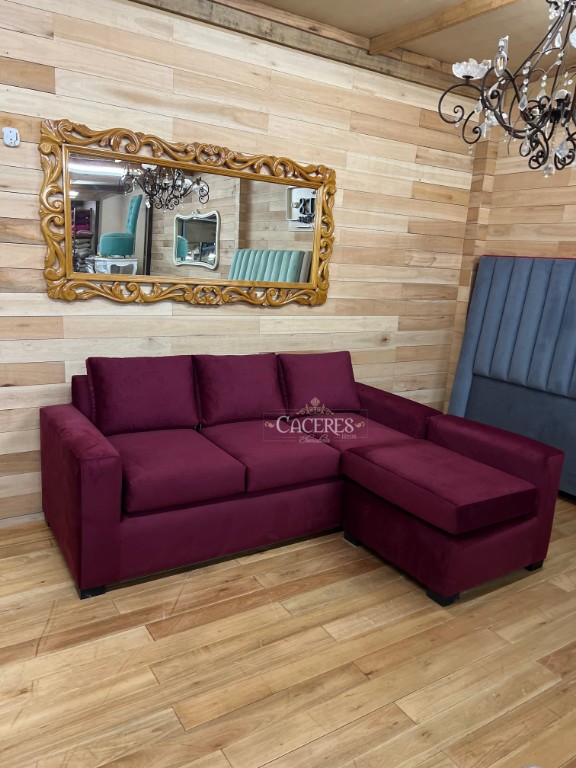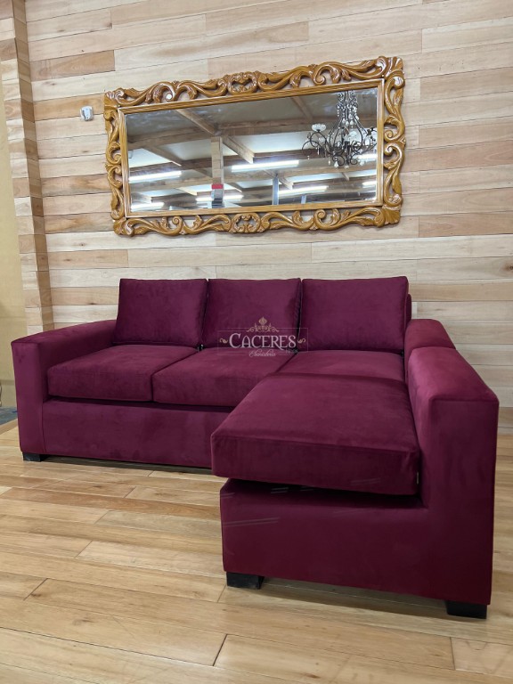 Realizado en madera maciza, tapiado en pana color bordo, patas de maderas en L