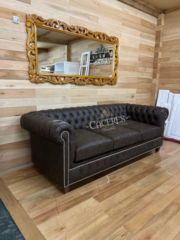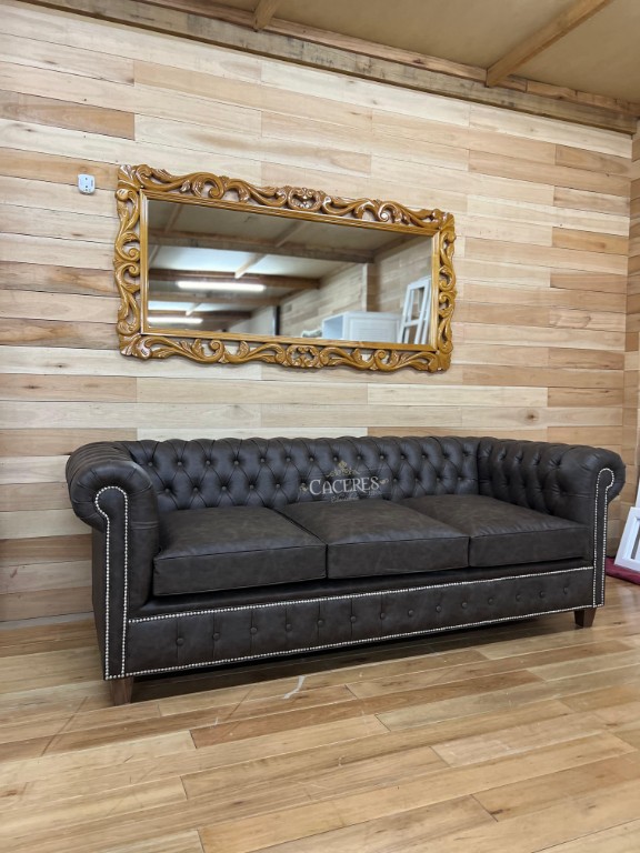 Realizado en madera maciza, tapizado en eco cuero marrón con capitone.