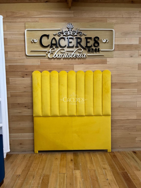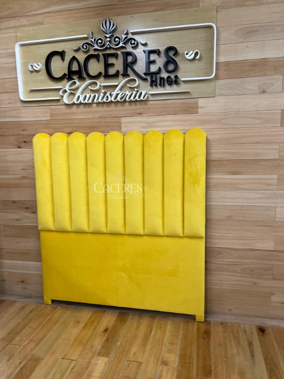 Realizado en madera maciza, tapizado en amarillo gris,