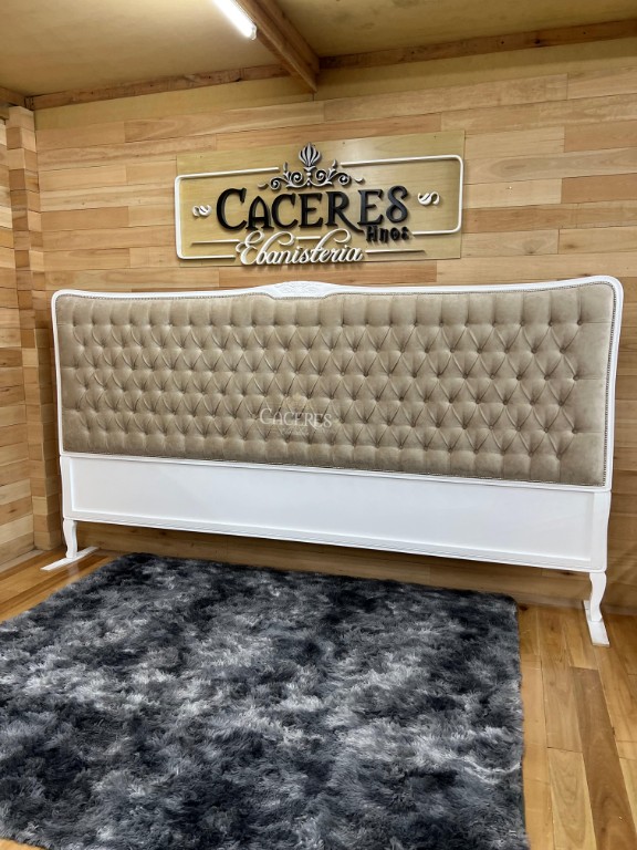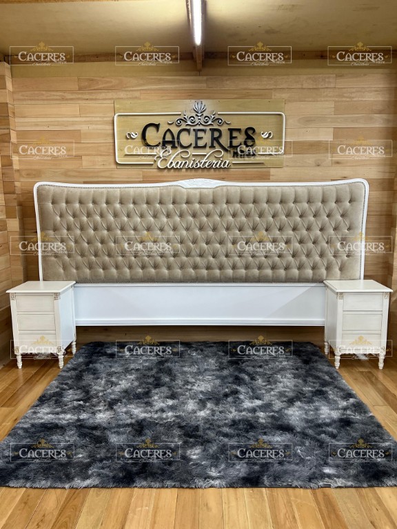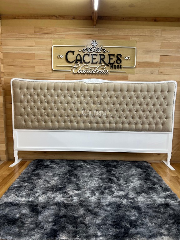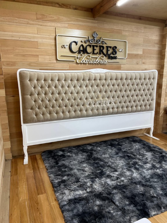 Realizado en madera maciza, tallado artesanalmente, laqueado en poliuretano color blanco, tapizado en pana beige