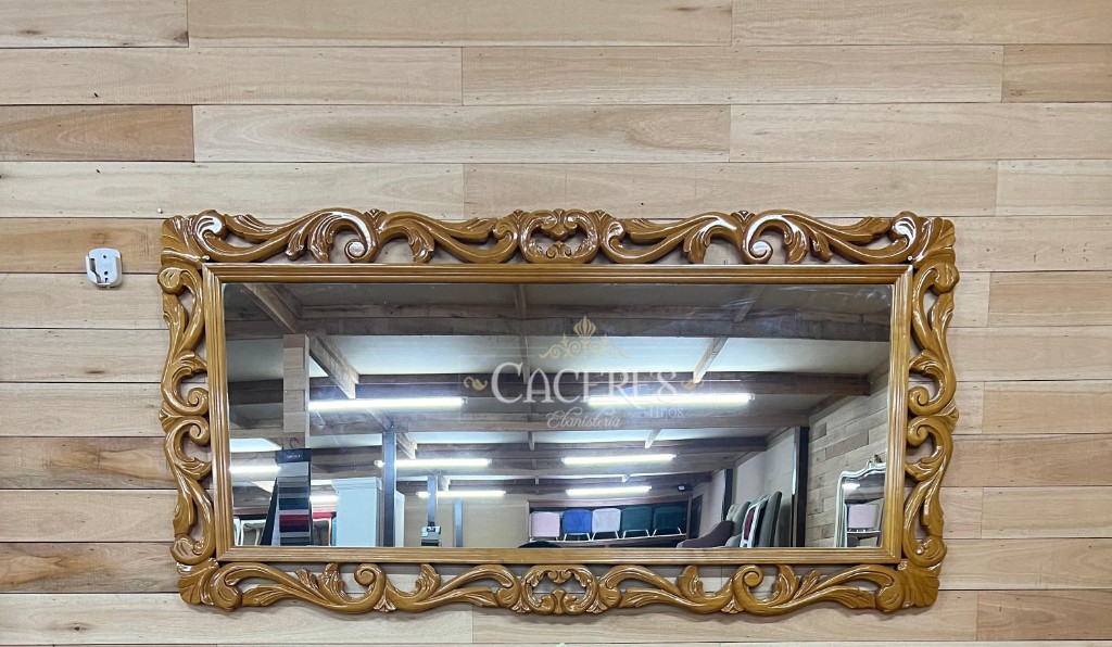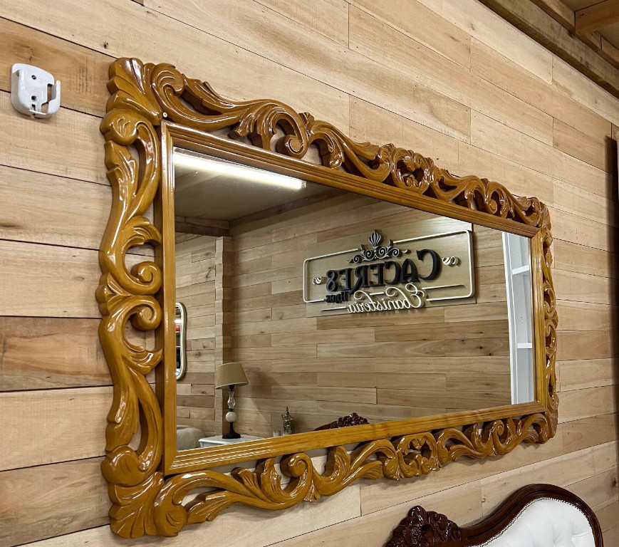 Realizado en madera maciza, tallado artesanalmente, laqueado en poliuretano color caramelo brillante.
