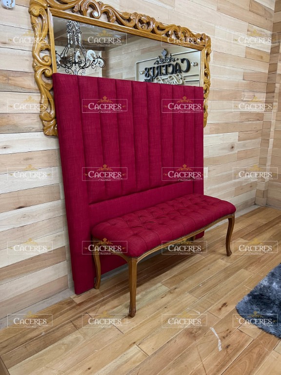 Realizado en madera maciza, tallado artesanalmente, laqueado en poliuretano color caramelo semi mate, tapizado en lino Bordo