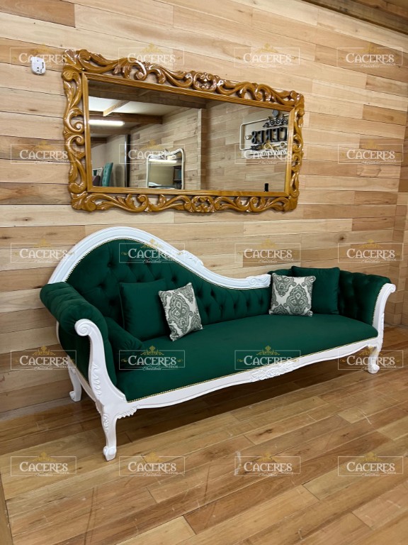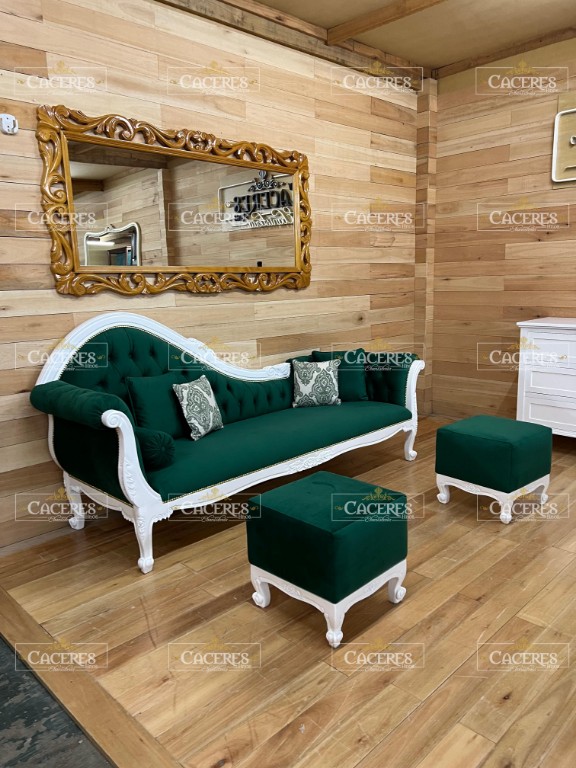 Realizado en madera maciza, tallado artesanalmente, laqueado en poliuretano color blanco brillante, tapizado en pana color verde, terminacion en tachas plateadas
