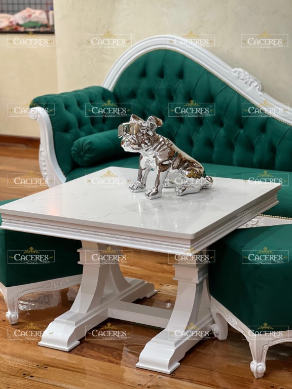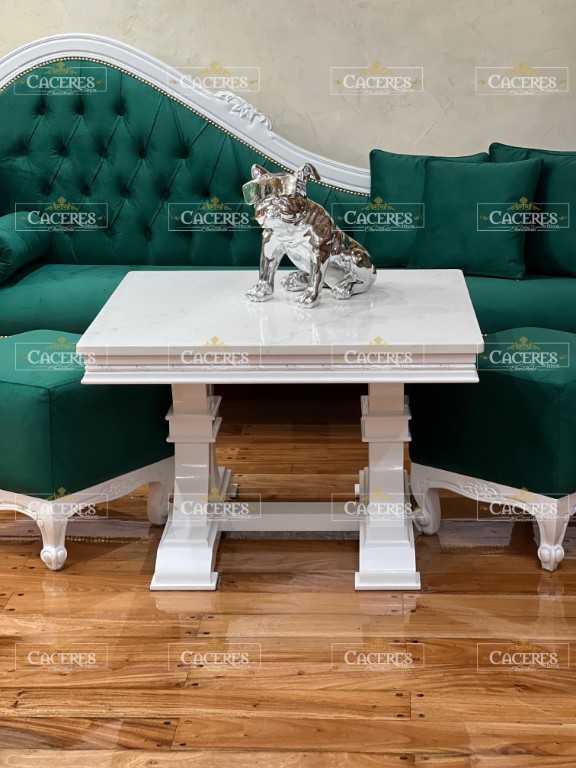 Realizado en madera maciza, tallado artesanalmente, laqueado en poliuretano color blanco brillante.