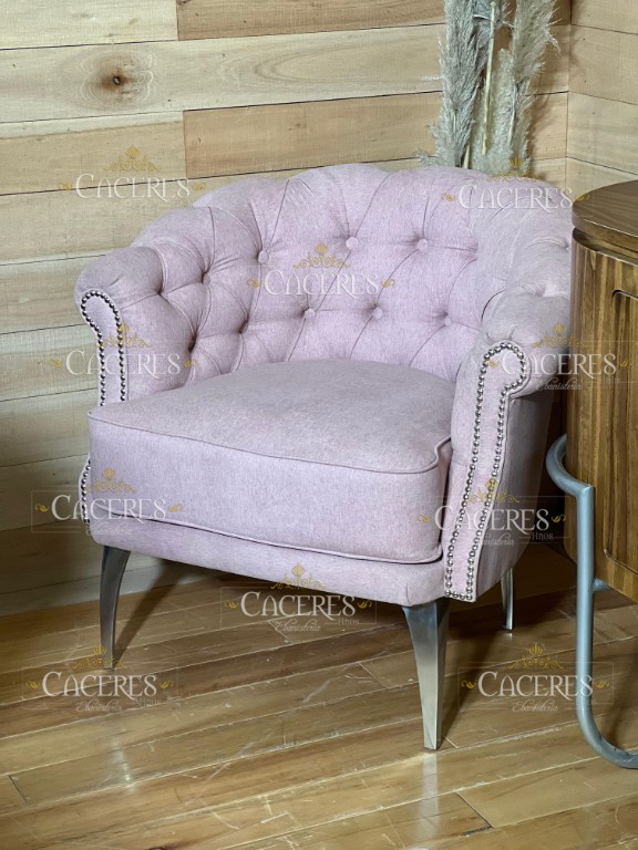 Realizado en madera maciza tallado artesanalmente, terminaciones a gusto (Tachas o cordón de vivo), tapizado en pana color rosa, patas a gusto.