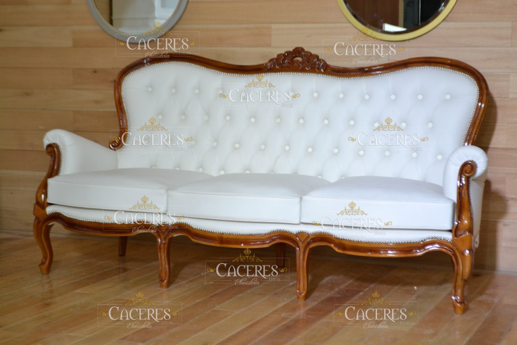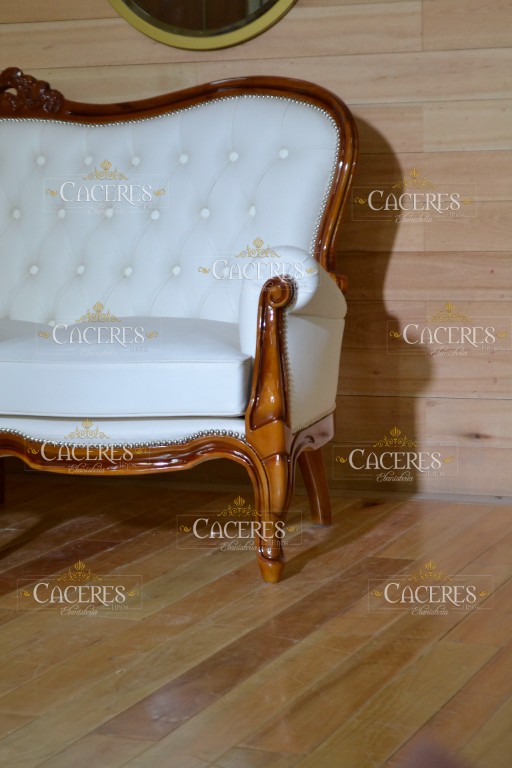 Realizado en madera maciza tallado artesanalmente, terminaciones a gusto (Tachas o cordón de vivo), tapizado en pana blanca, laqueado semi mate color caramelo fume patas a gusto.