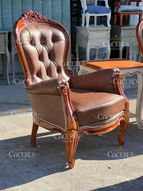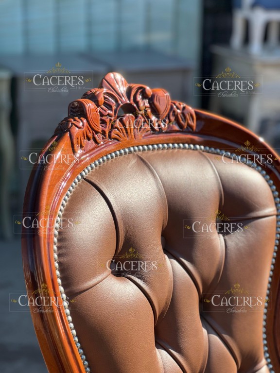 Realizado en madera maciza, tallado artesanalmente, laqueado en lustre color marrón dulce de leche brillante, tapizado en cuero vacuno color marrón oscuro, terminacion en tachas plata y cordón de vivo.