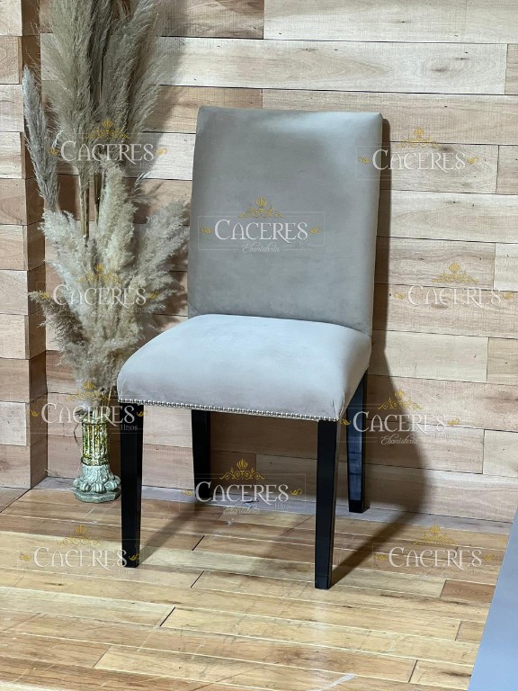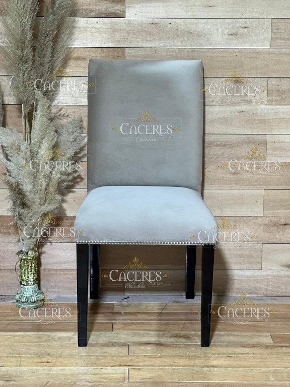 Realizado en madera maciza, tallado artesanalmente, laqueado en poliuretano color negro brillante tapizado en pana beige , terminacion en tachas plata.