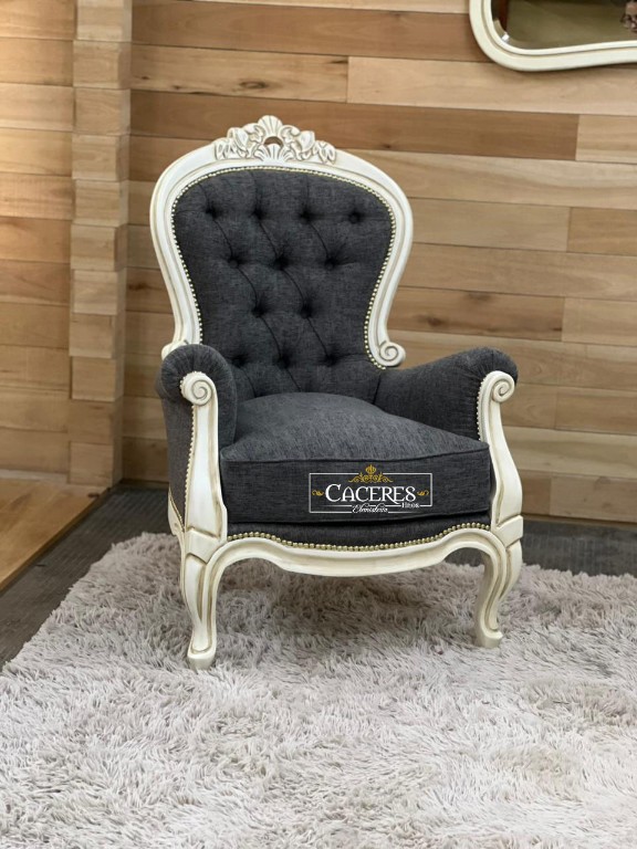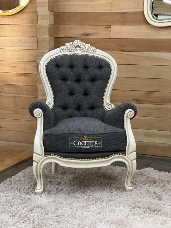 Realizado en madera maciza, tallado artesanalmente, laqueado en poliuretano color blanco marfil, tapizado en lino gris oscuro, terminacion en tachas doradas, tiempo de demora 20 dias hábiles aproximadamente!