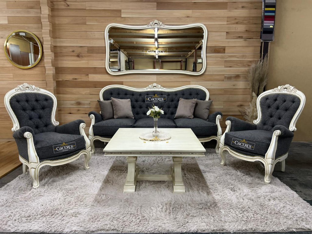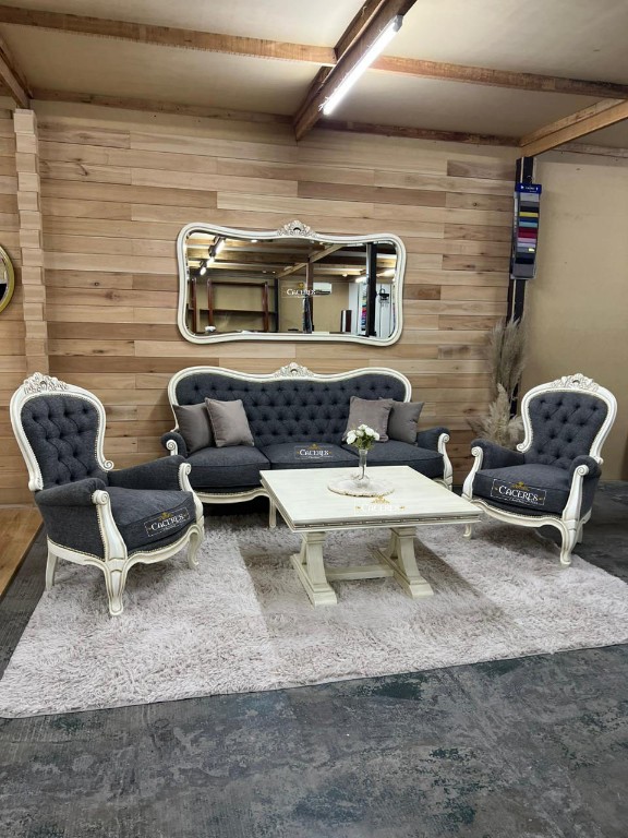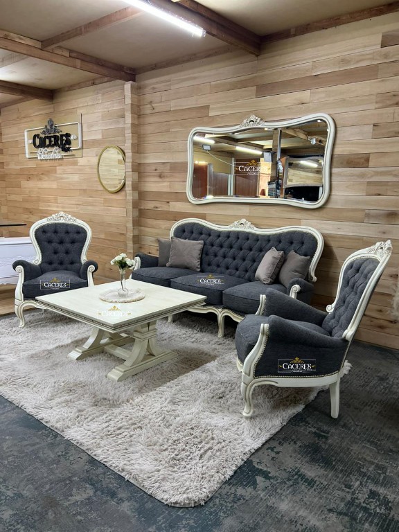 Realizado en madera maciza, tallado artesanalmente, laqueado en poliuretano color blanco marfil, tapizado en lino gris oscuro, terminación en tachas doradas, tiempo de demora 20 dias aproximadamente! Productos: 1 Sillón Colonial de 3 Cuerpos 2 Sillones Coloniales individuales 1 Mesa Ratona 1 Espejo colonial