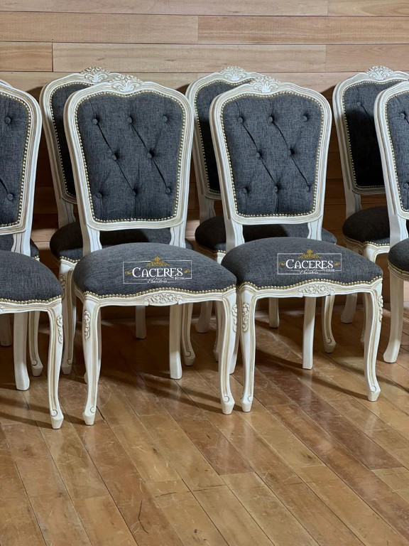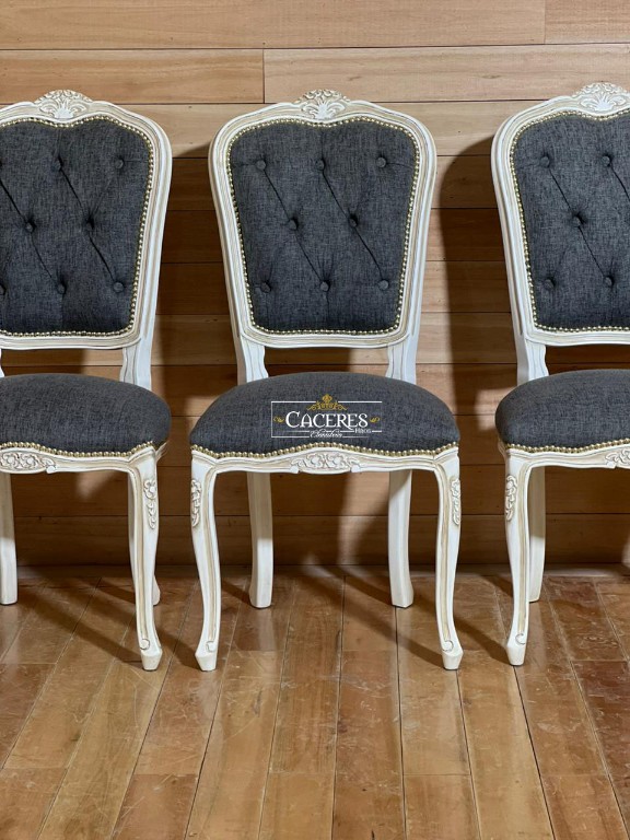 Realizado en madera maciza, tallado artesanalmente, laqueado en poliuretano color a elección, tapizado a elección (pana, lino o eco cuero), terminacion a elección (tachas o cordón de vivo), tiempo de demora 20 dias aproximadamente.