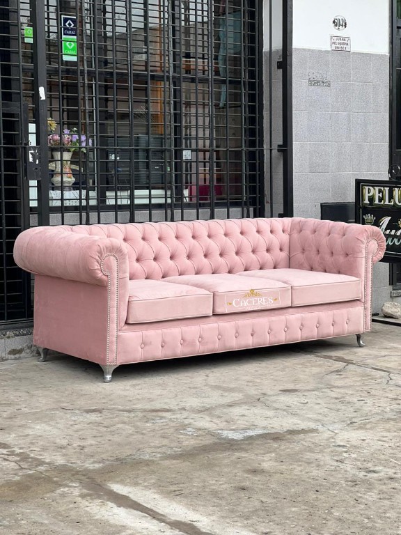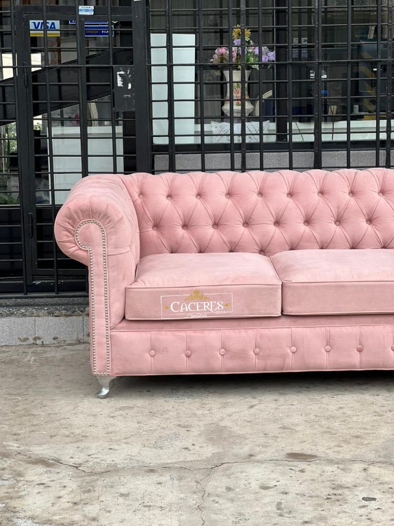 Realizado en madera maciza, tapizado en pana color rosa nude, terminacion en tachas plateadas, patas de acero. UNICA UNIDAD DISPONIBLE.