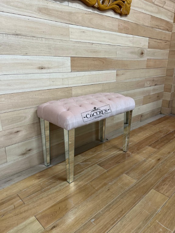 Realizado en madera maciza, tallado artesanalmente, tapizado en pana color rosa nude, con espejos en patas.