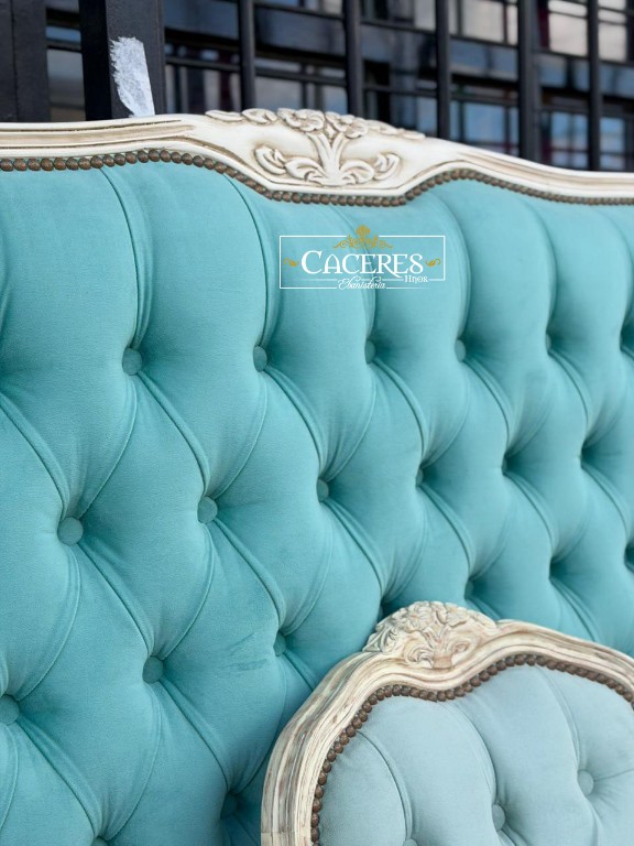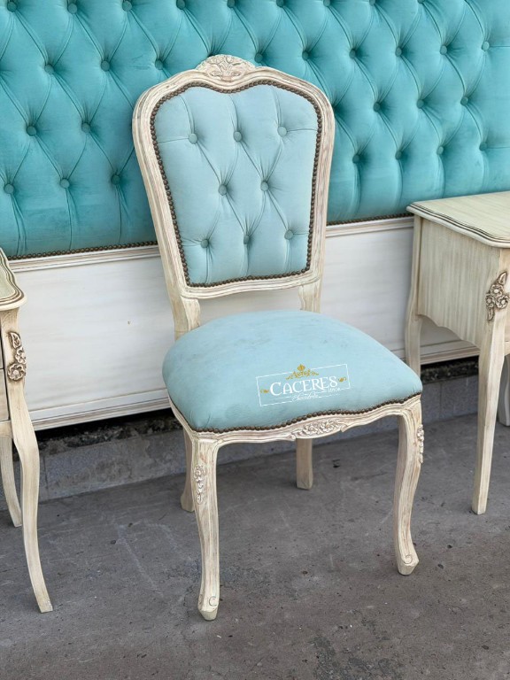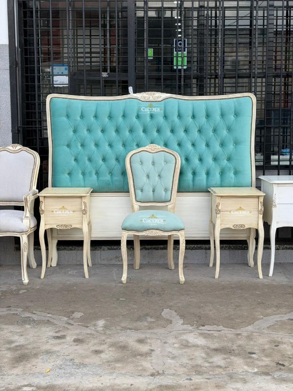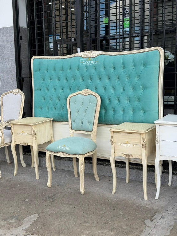 Realizado en madera maciza, tallado artesanalmente, laqueado en blanco marfil, tapizado en pana color verde agua terminacion en tachas plateadas, + entrega inmediata! 1 Respaldo luis xv 2 Mesas de luz 1 Silla Luis xv