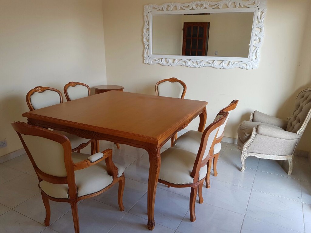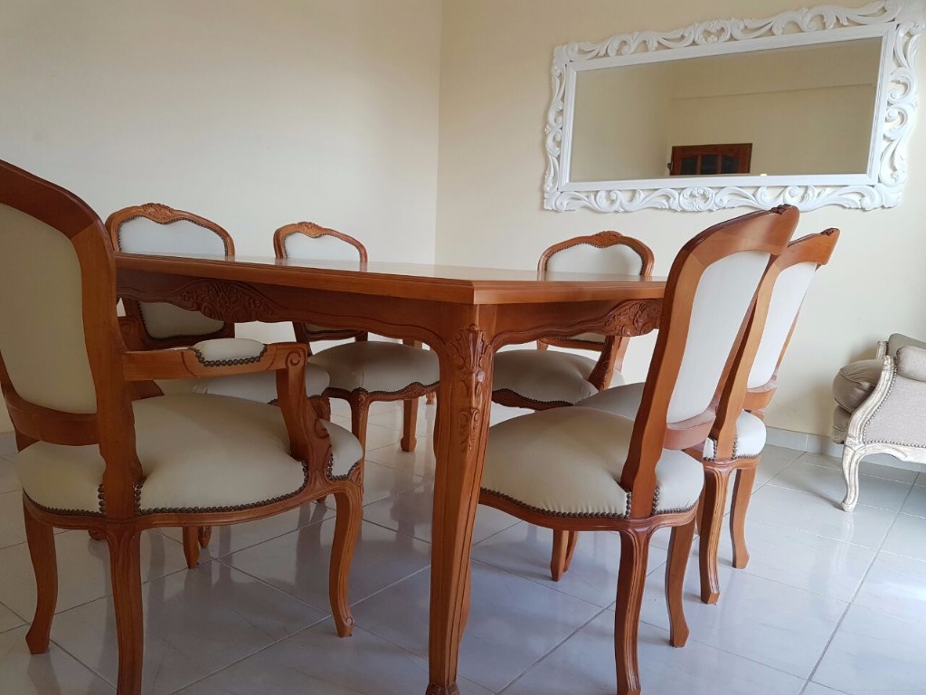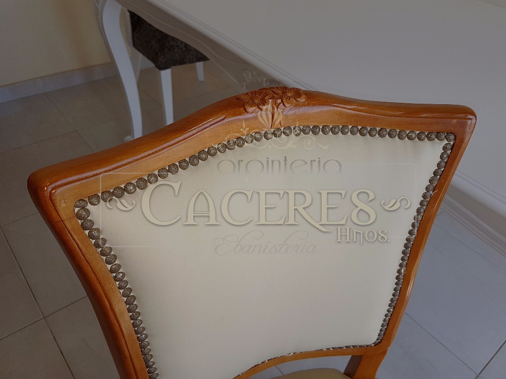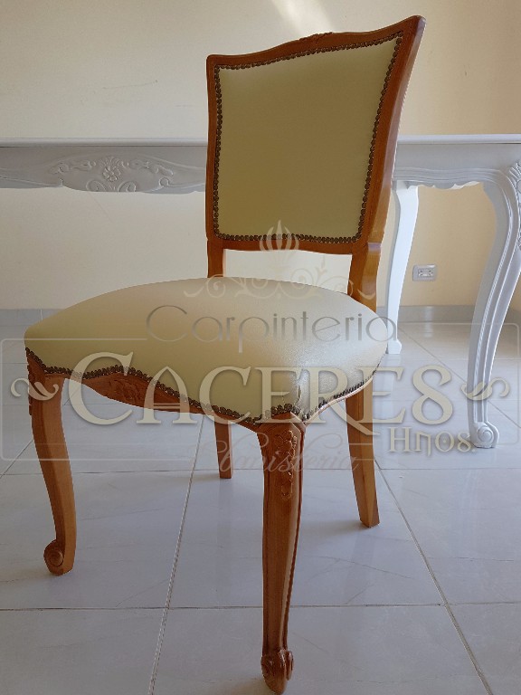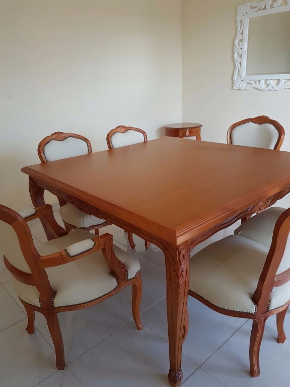 Mesa de comedor trabajado en madera de Guindo, por encastre y espiga. Tallado a mano. Disponible en diferentes medidas, terminaciones y combinaciones.
